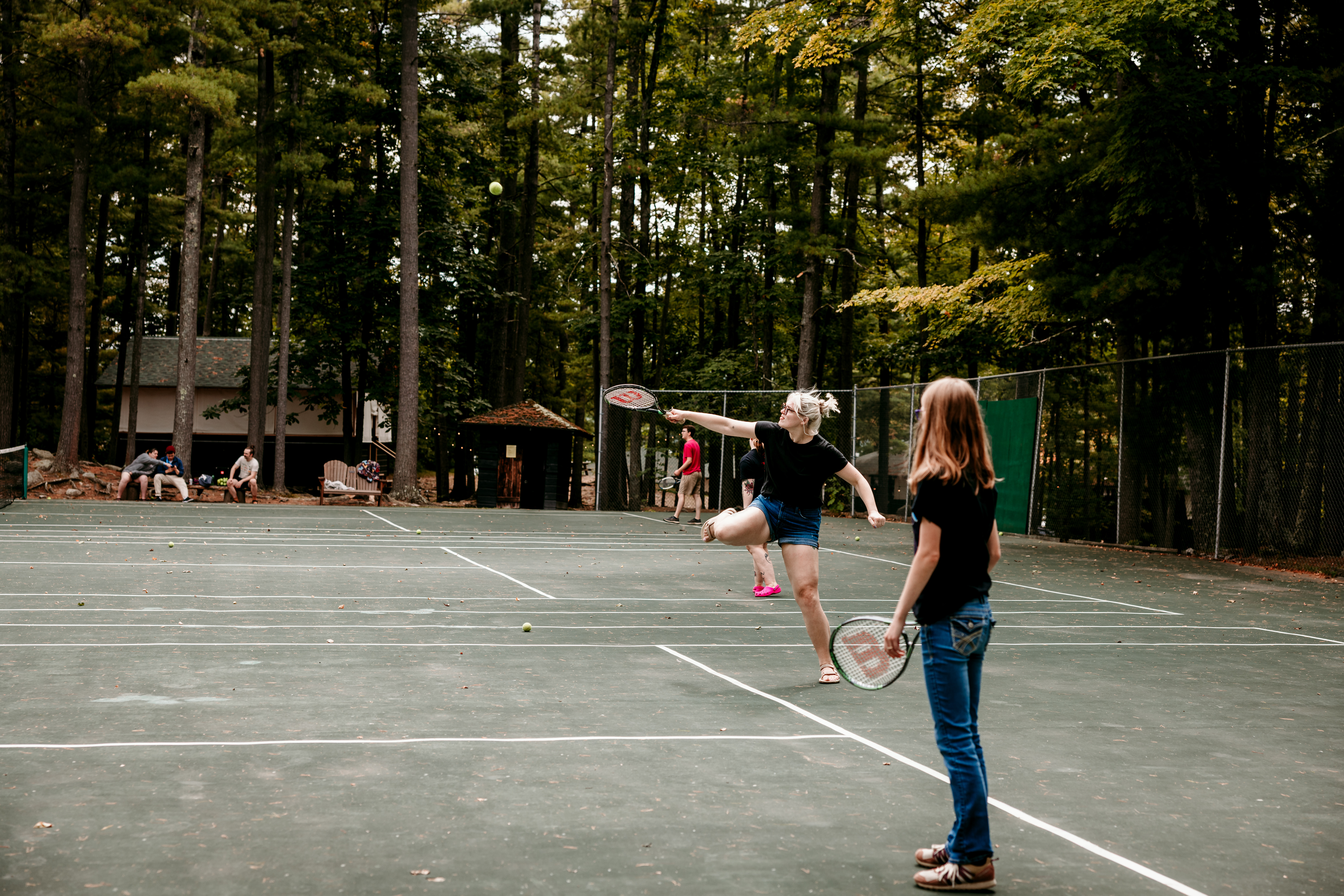 Guests spend time together hiking, kayaking, swimming, and relaxing around campfires.